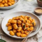 Delicious and easy 4-Ingredient Pumpkin Gnocchi served with a fragrant garlic and sage vegan butter sauce. Perfectly soft gnocchi made from pumpkin puree, potatoes, and flour, tossed in a rich, aromatic sauce and topped with vegan Parmesan and black pepper for a comforting fall-inspired meal.