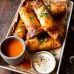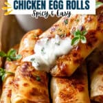 Delicious and crispy baked Buffalo chicken egg rolls served with a refreshing cilantro lime ranch dip, perfect for appetizers or snacks.