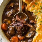 - For a slow cooker method, skip beef stock and use 2 crumbled beef stock cubes. After step 7, transfer to slow cooker and cook 6 hours on low or 3 hours on high, then add bacon and mushrooms and cook another 45 minutes. Thicken sauce on stovetop if needed.