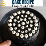 The mug cake is ready when it’s puffed up and a toothpick inserted in the center comes out clean. It might look a little lopsided or even collapse a bit as it cools — don’t sweat it, the flavor and texture will still be spot on. Let it cool for a couple of minutes before digging in or decorating with fun toppings like candy eyeballs if you’re feeling spooky!