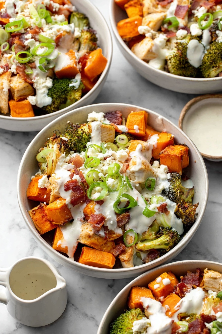 Once the sweet potatoes hit the 30-minute mark, take the casserole dish out and layer your buffalo-coated chicken and broccoli on top. Slide it back into the oven for another 20-25 minutes, until the chicken hits an internal temperature of 165°F—always trust a meat thermometer if you have one, it’s a game changer! When your timer goes off, pull the casserole out and immediately sprinkle on cheese, green onion, and cooked turkey bacon. Pop it back in for just 5 more minutes so the cheese can melt into that gooey perfection we all crave.