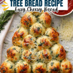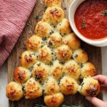 Cheesy Christmas Tree Bread is a festive and fun appetizer perfect for holiday gatherings. Soft pizza dough is stuffed with gooey mozzarella, shaped into a Christmas tree with bite-sized balls, brushed with a flavorful garlic herb butter, and baked to golden perfection. Served with marinara and pesto for dipping, it’s a delicious and crowd-pleasing treat.