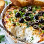 This Cheesy Baked Olive Dip combines creamy sour cream and cream cheese with melted mozzarella and Parmesan cheeses, accented by savory black and green olives. Perfectly baked until golden and bubbly, it’s an irresistible appetizer served warm with sliced French baguette.