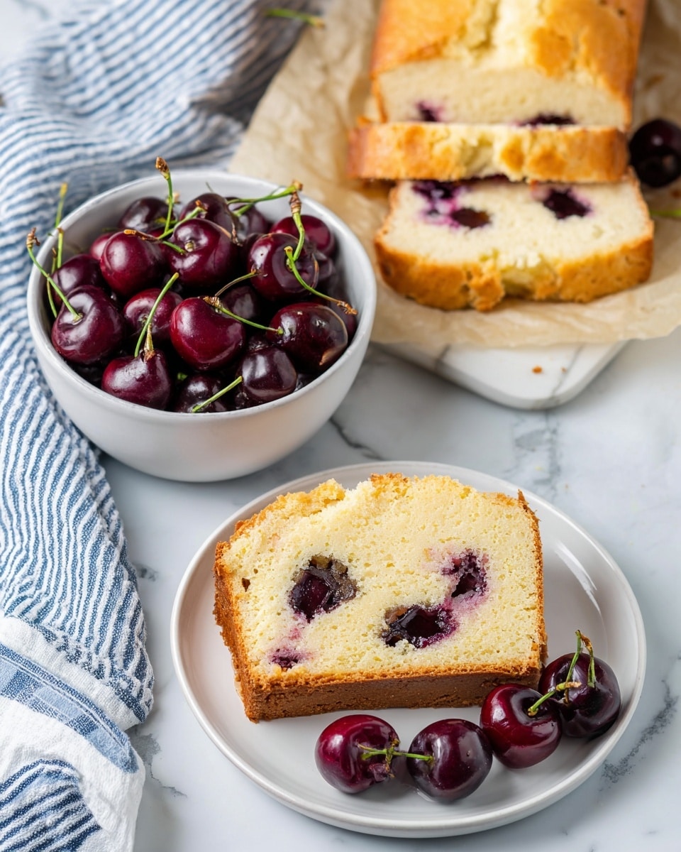 Lightly coat the cherries with a tablespoon of flour before folding them into the batter. This simple step helps suspend them evenly throughout the loaf.