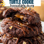 Delicious Turtle Cookies combining rich cocoa, soft caramel, crunchy pecans, and chocolate chips, finished with a smooth chocolate drizzle. Perfectly soft with a delightful mix of textures and flavors.