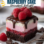 A decadent Chocolate Raspberry Drip Cake featuring moist cocoa layers filled with tangy raspberry cream cheese filling, topped with a rich chocolate ganache drip, fresh raspberries, and chocolate shavings for an elegant dessert.