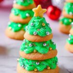 Create festive Stacked Christmas Tree Cookies with soft buttery layers and rich green buttercream frosting. Perfect for holiday celebrations, these cookies are stacked in three sizes and decorated with star sprinkles and pearl candies for a charming holiday treat.