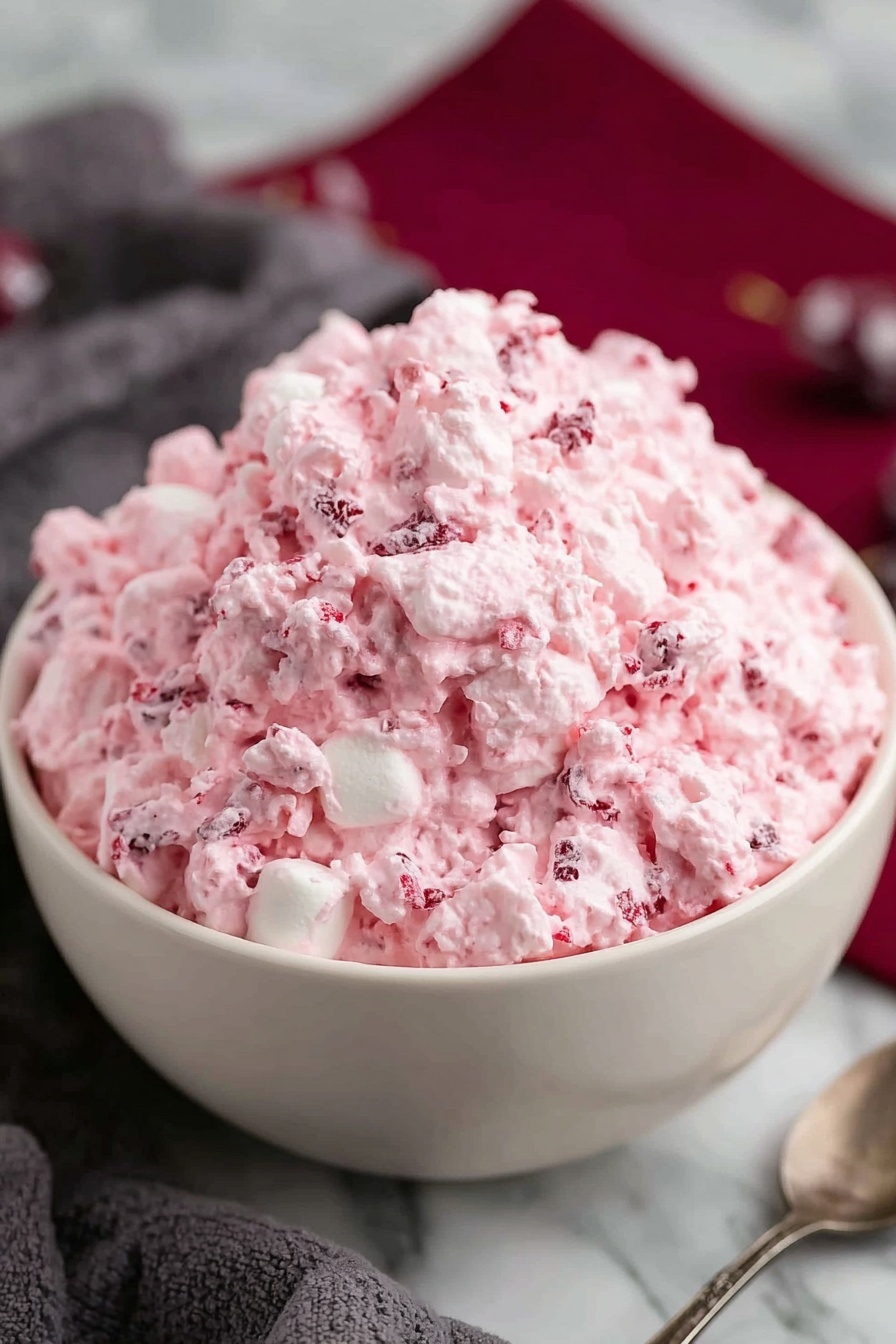 I like topping my Cranberry Fluff Salad with a sprinkle of toasted chopped pecans or walnuts—they add crunch and some earthy warmth. A few fresh mint leaves on top make it look pretty and add a refreshing pop. If I’m feeling festive, a few whole cranberries scattered on top brighten the presentation and give a little extra bite.