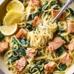 This creamy salmon pasta recipe combines tender baked salmon with a luscious garlic cream sauce, brightened with lemon zest and fresh spinach. Perfect for a comforting yet elegant dinner, it features linguine tossed in a rich sauce with capers for a subtle tang and finished with fresh lemon wedges.