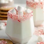 For special occasions, I like to serve this in clear glass mugs so you can see all the layers – the white chocolate base topped with snowy whipped cream and a bright candy cane or colorful sprinkles. It’s perfect for winter parties or even Valentine’s Day, making it feel festive and extra special.