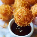 Delicious and crispy Fried Shrimp Balls made with fresh shrimp blended into a smooth paste, coated with spring roll wrapper strips, and deep-fried to golden perfection. Perfect as an appetizer or snack served with your favorite chili sauce.