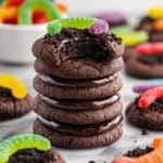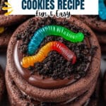 I keep these cookies in an airtight container at room temperature when serving within a few days. This keeps the ganache smooth and the gummy worms chewy. If it’s warm where you live, refrigerate to avoid melting, but bring the cookies back to room temp for the best texture before eating.
