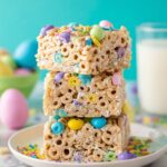 Easter Rice Krispie Treats are a colorful and festive twist on the classic marshmallow rice cereal treat, combining Rice Krispies, Rice Chex, Frosted Cheerios, Easter M&Ms, and sprinkles for a fun and delicious dessert perfect for springtime celebrations.