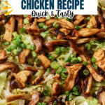 A flavorful Moo Shu Chicken recipe featuring tender chicken strips marinated in a savory hoisin-based sauce, combined with mushrooms, cabbage, and scrambled eggs, stir-fried to perfection and served with fresh scallions.