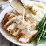 This classic turkey gravy recipe is made from pan drippings, enriched with butter, aromatic herbs, and thickened with flour to create a smooth and flavorful sauce perfect for complementing your turkey or other poultry dishes.