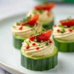I don’t recommend freezing these cucumber bites once assembled because cucumbers turn watery and lose their crunch. However, the chickpea purée freezes well—just thaw overnight in the fridge and give it a good stir before using.