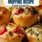 This easy no-knead focaccia muffins recipe yields 12 flavorful muffins with three topping variations: basil pesto, rosemary and salt, and cherry tomatoes with olives and oregano. Perfect as a snack or appetizer, these airy, golden focaccia muffins require minimal effort with an overnight proofing and simple baking.