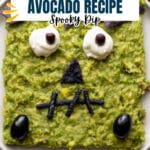 Frankenguac is a fun and festive guacamole recipe featuring mashed avocados seasoned with lime juice, cumin, and salt, then mixed with fresh onions, cilantro, and garlic. The guacamole is shaped into a rectangular form and decorated with tortilla chips, sour cream, black olives, and black beans for a colorful presentation, perfect for parties or snacks.