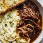 For a special occasion, I like to serve shredded roast over individual buttered dinner rolls, topped with a spoonful of the onion sauce and fresh herbs—kinda like elegant sliders. It’s an unexpected but cozy presentation that guests adore!