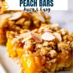 Delicious fresh peach bars with a buttery oatmeal crust and almond crumble topping. These bars feature a sweet and tangy peach filling thickened with cornstarch and balanced by a cinnamon-spiced oat crumble. Perfect as a summertime dessert or snack.