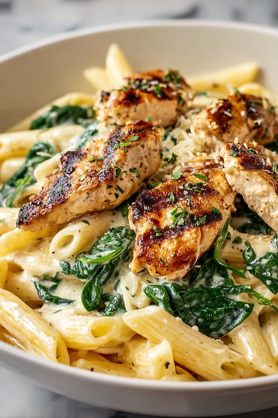 Return the cooked chicken to the skillet and add the drained pasta as well. Toss everything gently to combine, adding some reserved pasta water if needed to loosen the sauce to your liking. Lastly, stir in baby spinach until it wilts into the sauce—just about 1-2 minutes. The greens add a lovely pop of color and fresh flavor that brightens the whole dish.