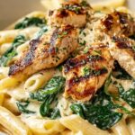 - Combine and Finish: Return cooked chicken to the skillet along with the drained pasta. Add baby spinach and toss everything together over low heat until spinach wilts and the pasta is well coated with sauce. If the sauce is too thick, add 1-2 tablespoons of reserved pasta water to loosen it up.