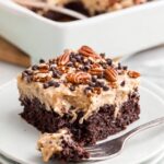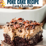 This German Chocolate Poke Cake combines a rich chocolate cake with a luscious mixture of sweetened condensed milk and hot fudge, soaked into the cake’s holes for extra moisture and flavor. Topped with creamy coconut pecan frosting, chopped pecans, and mini chocolate chips, this dessert is a decadent treat perfect for any occasion.