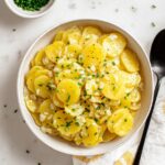 I usually store leftover German Potato Salad in an airtight container in the fridge for up to 2 days. Because the potatoes soak up the dressing, the flavors deepen overnight, which I actually love. Just remember to add fresh chives before serving again, or the herbs can look a little tired.