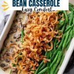 A classic Green Bean Casserole made with tender blanched green beans, a rich mushroom sauce infused with garlic and thyme, topped with crispy French fried onions and Parmesan cheese for a delightful holiday side dish.