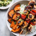 - Serve: Serve the grilled chicken skewers and sweet potatoes over a bed of steamed white or brown rice. Top with the fresh avocado salsa and garnish with extra fresh herbs if desired for a burst of flavor.