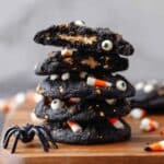 Leftover Halloween Black Monster Cookies stay fresh in an airtight container at room temperature for about 4-5 days. I recommend stacking them with parchment paper between layers to keep the sprinkles and candies intact. They remain delightfully chewy—perfect for a little treat whenever the craving hits.