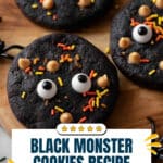 Spooky and delicious Halloween Black Monster Cookies made with black cocoa powder, peanut butter chips, and festive Halloween sprinkles. Perfect for a creepy cookie treat at your next Halloween party.