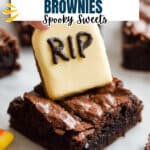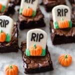 These Halloween Brownies are a spooky and delicious treat perfect for the fall season. Featuring fudgy brownies topped with mini Milano cookie headstones decorated with edible black gel, green buttercream frosting, and candy pumpkins, they create a festive graveyard scene that’s sure to impress at any Halloween party.