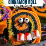 Celebrate Halloween with these festive Halloween Cinnamon Rolls featuring vibrant orange dough, a bold black cinnamon filling, and bright green frosting topped with marshmallow teeth and candy eyeballs for a spooky treat perfect for a party or family gathering.