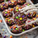 Delightfully festive Halloween Cookies loaded with M&Ms Ghoul’s Mix, Reese’s Pieces, chocolate chips, and candy eyeballs, creating a perfect treat for the spooky season. These cocoa-rich cookies have a tender crumb with colorful candies and sprinkles for extra fun and texture.