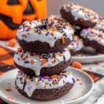 While the donuts cool, I whisk together confectioner’s sugar and milk until smooth and thick but still pourable. Then I dip the donut tops in the glaze and immediately sprinkle on festive Halloween sprinkles before the glaze sets—that way they stick perfectly. After they dry for a bit, they’re ready to serve!