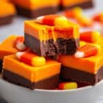 If you’re bringing this to a party, I like to present my fudge squares on a dark wooden board and scatter a few loose candy corn around for ambiance. Wrapping individual pieces in cellophane tied with orange and black ribbons makes for super cute Halloween treats or party favors too. Layering the fudge squares in a clear glass container with mini pumpkins and spooky themed decor creates an eye-catching centerpiece.
