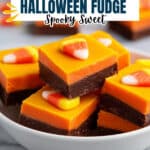 This Halloween Fudge Recipe features a festive two-layer treat combining semi-sweet and white chocolate fudge with bright orange coloring and candy corn topping, perfect for a spooky celebration.