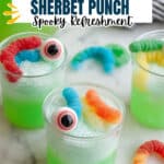 This Halloween Lime Sherbet Punch is a spooky and refreshing beverage perfect for festive gatherings. Combining green berry blast Hawaiian Punch, Sprite, pineapple juice, and lime sherbet, it creates a fizzy, creamy, and tangy punch garnished with gummy worms and eyeballs for a fun, eerie touch.