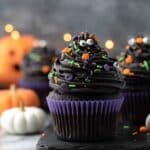 These Halloween monster black velvet cupcakes feature rich black cocoa cupcakes topped with a smooth and decadent black Swiss meringue buttercream. Decorated with fun monster sprinkles and edible eyes, they make a spooky and delicious treat perfect for Halloween parties and festive gatherings.