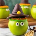 These witch apple snacks keep best stored in an airtight container in the fridge for up to 3 days. To avoid sogginess, I try to keep the hats separate from moisture until serving, but honestly, they’re always gobbled up fast at our house!