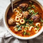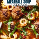 A comforting Italian Meatball Soup featuring tender homemade pork meatballs simmered in a flavorful tomato and chicken stock broth with pasta, herbs, and aromatic seasonings.