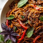 A quick and flavorful Korean-inspired dish featuring tender flank steak and mixed vegetables tossed in a savory and spicy sesame sauce, served over brown rice noodles. Ready in just 25 minutes, perfect for a weeknight dinner.