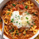 A hearty and comforting Lasagna Soup featuring ground beef, bowtie pasta, and rich tomato broth, topped with ricotta, mozzarella, and parmesan cheeses. This recipe offers both stovetop and pressure cooker methods, perfect for a flavorful, cozy meal.