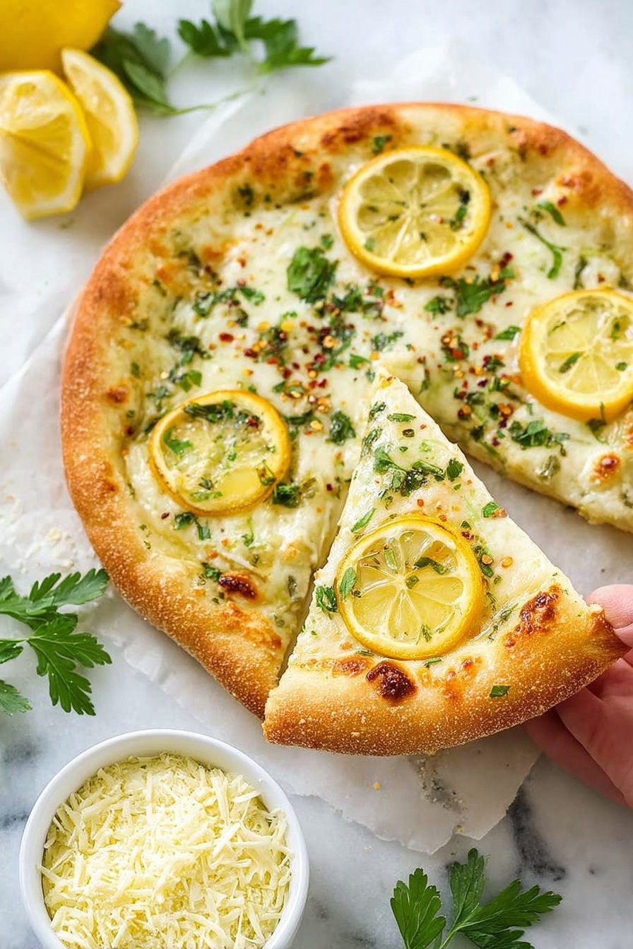 A bright and flavorful Lemon Pizza featuring a crispy dough base topped with a tangy lemon brine, fresh mozzarella, and parmesan cheese. Perfect for a refreshing twist on traditional pizza that’s easy to make at home.