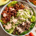 Layer chopped romaine in your serving bowls, then mound the seasoned ground beef in the center. Surround it with juicy cherry tomatoes, pickle chips, crumbled bacon, and those caramelized onions you just made. Dollop the guacamole on the side and drizzle generously with your special sauce. If you’re like me, you’ll probably want extra sauce, so keep it handy!
