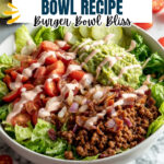 - Assemble the Burger Bowls: Divide roughly 8-9 cups chopped romaine lettuce evenly among four serving bowls. Place an equal portion of cooked ground beef atop the lettuce in each bowl. Arrange 1 ½ cups cherry tomatoes, ½ cup pickle chips, 8-10 crumbled bacon slices, sautéed red onions, and prepared guacamole around the beef. Drizzle generously with the special sauce and serve immediately with extra sauce on the side if desired.