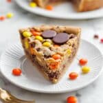 Pour your thick batter into the prepared pie plate and lightly smooth the top. This is where I press the miniature peanut butter cups all over the surface, pushing them just flush with the dough so they melt right in as it bakes. Then sprinkle an extra 1 to 2 tablespoons of Reese’s Pieces on top for that added pop of color and texture. Pop it in the oven and bake for about 26 to 29 minutes. You want the edges golden and the center set but still a bit soft—you can test by poking a toothpick in; it should come out with a few moist crumbs, never wet batter.
