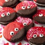 Delightful Love Bug Oreo Cookies coated in vibrant red melted chocolate wafers, decorated with royal icing eyes and micro heart sprinkles for a festive Valentine’s Day treat perfect for gifting or sharing.