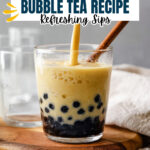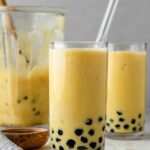 A refreshing and tropical Mango Bubble Tea made with sweet tapioca pearls, green tea, ripe mangoes, and creamy plant-based milk. This vegan-friendly beverage is perfect for a deliciously fruity twist on classic bubble tea.